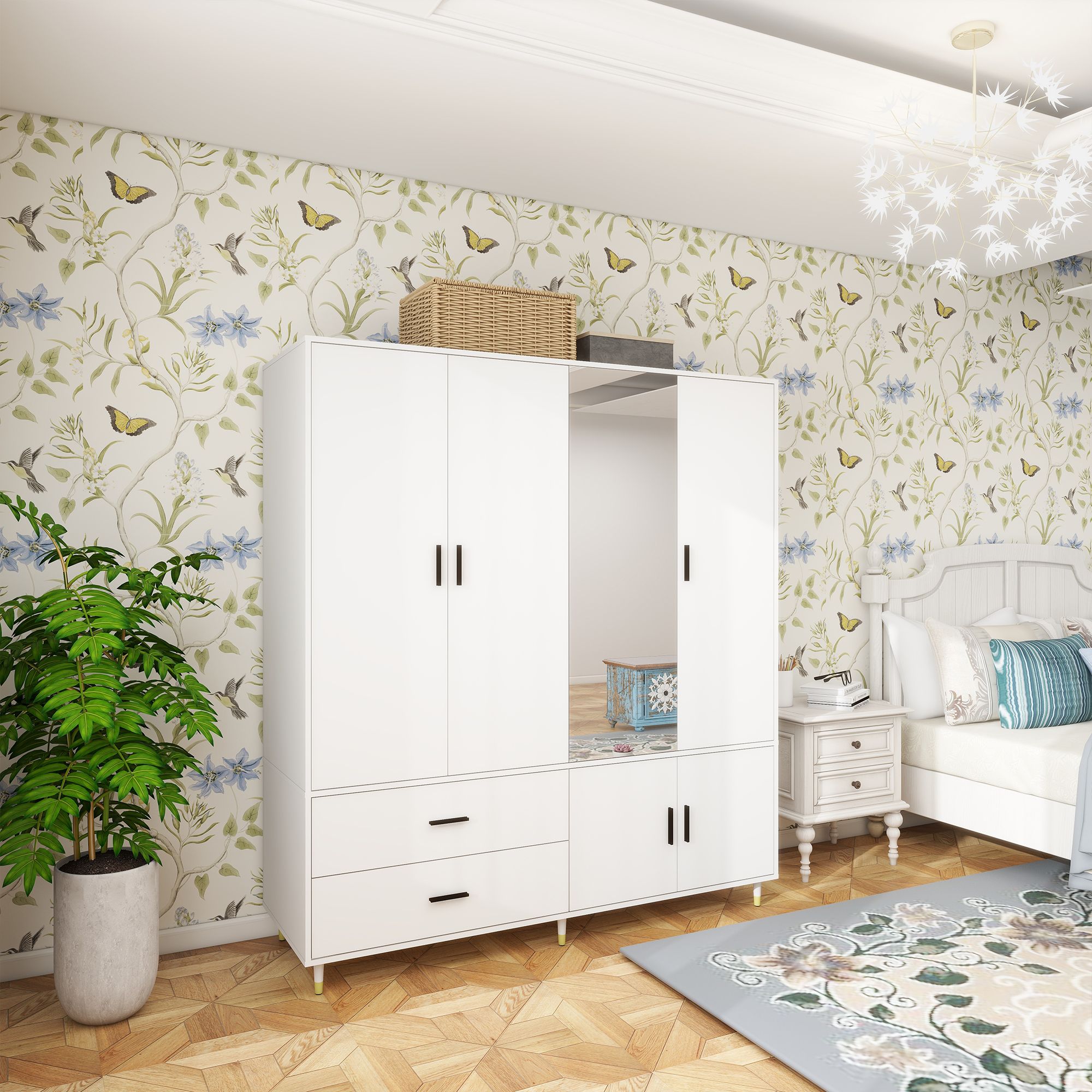 1.Spacious Design: This 4-door armoire wardrobe closet with 2 drawers, 2 hanging rods, a large mirror, and a spacious bottom cabinet provides ample storage space for your clothes, shoes, and accessories. Its square design and clean lines make it a stylish addition to any bedroom.